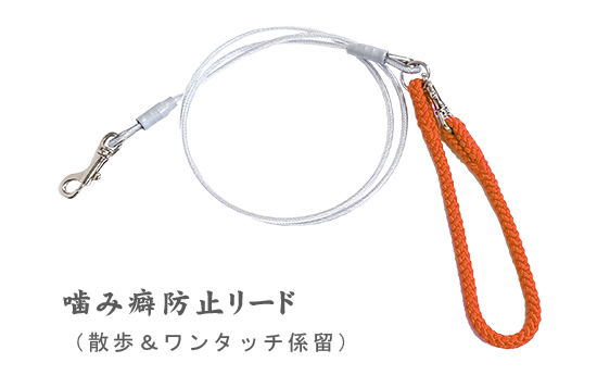 柴犬専門犬舎ではリードの噛みちぎりを防止する為、幼犬期にワイヤーなどの噛みちぎれないリードを使用し、しつけをします。一般的にしつけ後はリードは噛めない物と認識し噛まない様になります。持ち手にナスカンが付いていますので、どの部分にも引っ掛ける事が可能。(リード部分はワイヤーにビニールコーティングが施されています)持ち手とリード先端にはナスカン(大)を使用。[太さ:リード4mm持ち手8mm][長さ:1.5M]