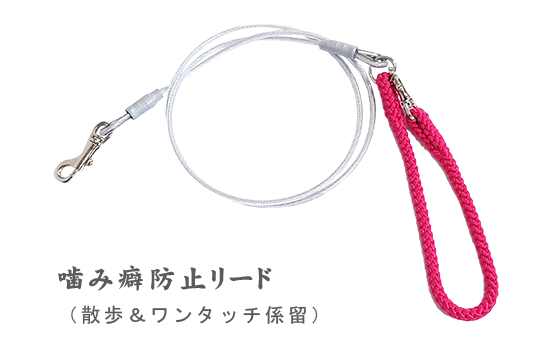 柴犬専門犬舎ではリードの噛みちぎりを防止する為、幼犬期にワイヤーなどの噛みちぎれないリードを使用し、しつけをします。一般的にしつけ後はリードは噛めない物と認識し噛まない様になります。持ち手にナスカンが付いていますので、どの部分にも引っ掛ける事が可能。(リード部分はワイヤーにビニールコーティングが施されています)持ち手とリード先端にはナスカン(大)を使用。[太さ:リード4mm持ち手8mm][長さ:1.5M]
